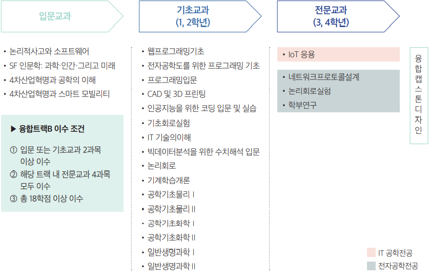 본 트랙은 기계시스템학부, IT공학전공, 전자공학전공, 화공생명공학부의 협업으로 ICT 첨단 기술을 융합하여 자율주행차와 헬스케어시스템 등을 위한 연결과 협업을 지원하는 커넥티드/IoT 기술을 교육하는 트랙이다.